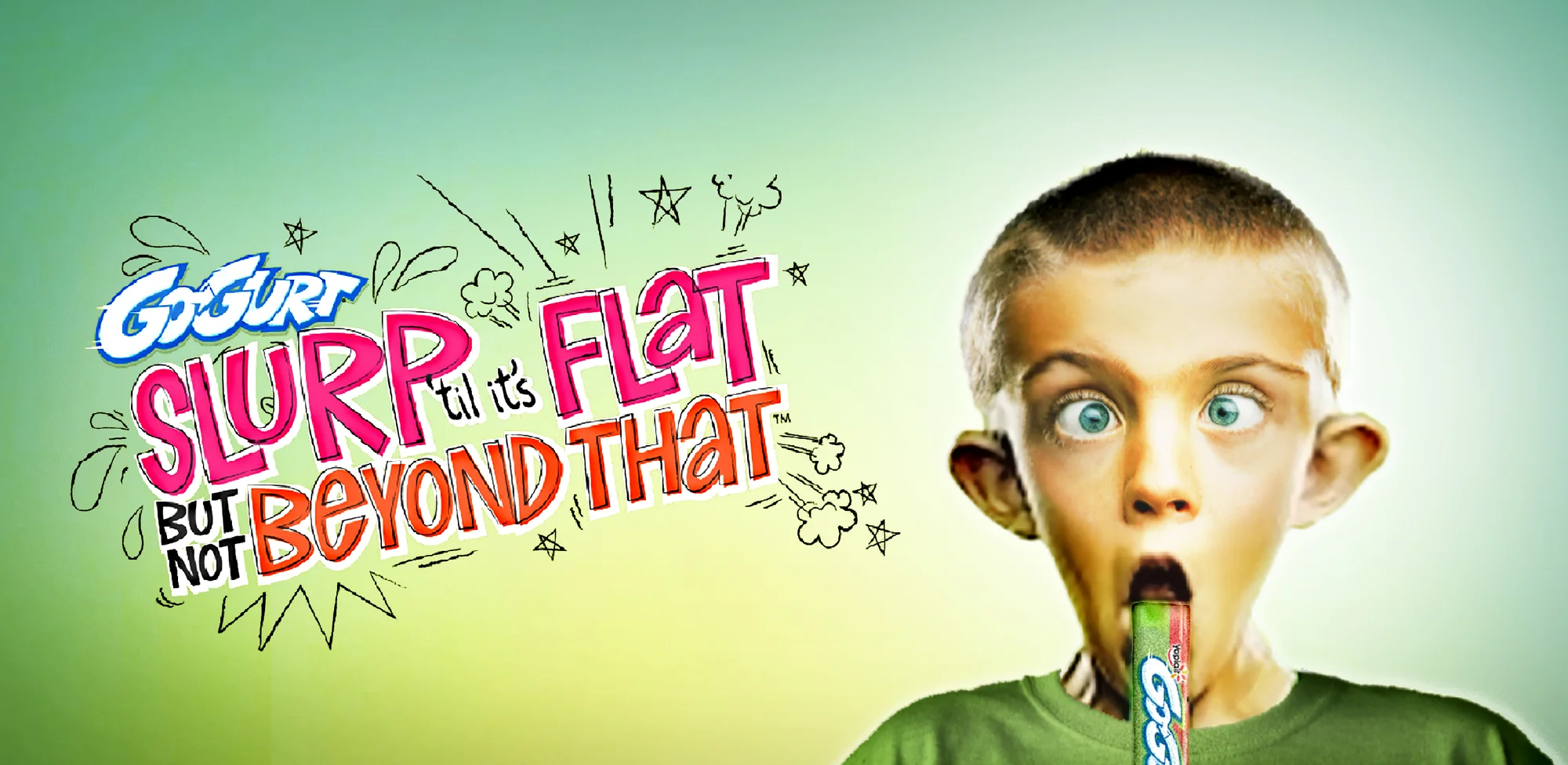 ‘SLURP ’TIL IT’S FLAT’ WAS INSPIRED BY WATCHING KIDS SLURP THEIR GO-GURT TUBES FLAT. WE NOTICED THAT THE KIDS FOUND THE SLURPING WAS FUN DUE TO THREE OBSERVATIONS: 1) SUCKING GO-GURT INEVITABLY CAUSED AN AUDIBLE, OBNOXIOUS FLATULATION SOUND. 2) THE 'OVER-SUCKED' TUBES CURLED UP LIKE CARNIVAL WHISTLES. 3) THE ACTION OF THE 'OVER-SLURP' CAUSED A LACK OF OXYGEN TO THE HEAD, WHICH LED TO A DIZZY EUPHORIA. THIS CAMPAIGN WAS A NO-BRAINER.